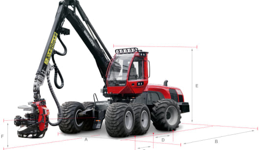 | A. Ширина | Колеса 600/45x24,5: 2 656 mm. Колеса 650/45x24,5: 2 760 mm. Колеса 710/40x24,5: 2 886 mm. |