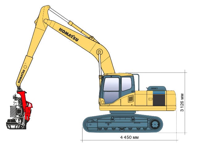 | Общая информация | Траки увеличенной ширины. 4 варианта стрелы. Система пожаротушения. 32 мм переднее остекление. Аксессуары на двигатель и кабину. Дополнительные гидравлические насосы, клапаны и линии. |